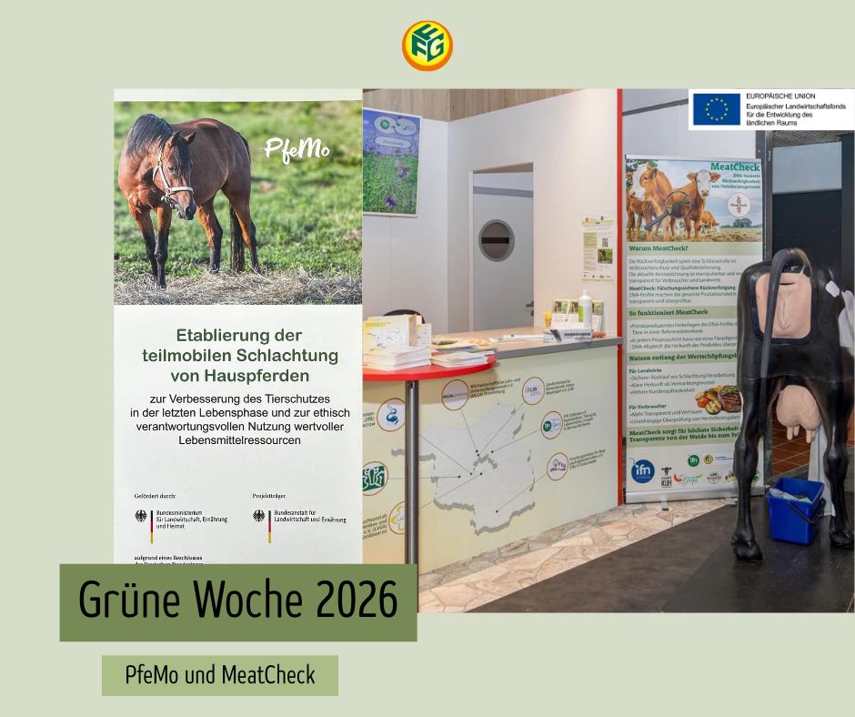 PfeMo widmet sich der Entwicklung und Erprobung von Konzepten zur teilmobilen Schlachtung von Pferden und adressiert damit zentrale Aspekte von Tierwohl und Praxistauglichkeit. Das Projekt wird durch das BMLEH gefördert. Auf der Grünen Woche wurden aktiv Besucher für einen Fragebogen zu Meinungen und Erfahrungen zum Thema Euthanasie und Schlachtung von Equiden sowie der Einstellung zu dem Lebensmittel Pferdefleisch gewonnen und wertvolle Rückmeldungen eingesammelt. Danke an alle, die teilgenommen haben!